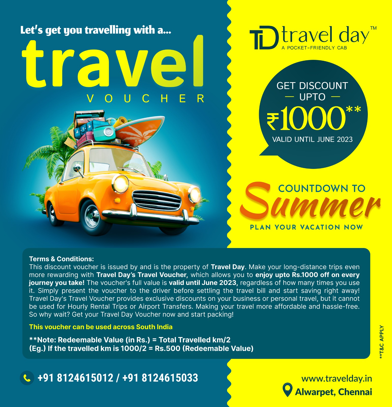 This discount voucher is issued by and is the property of Travel Day. Make your long-distance trips even more rewarding with Travel Day’s Travel Voucher, which allows you to enjoy up to Rs. 1000 off on every journey you take! The voucher's full value is valid until June 2023, regardless of how many times you use it. Simply present the voucher to the driver before settling the travel bill and start saving right away! Travel Day's Travel Voucher provides exclusive discounts on your business or personal travel, but it cannot be used for hourly rental trips or airport transfers. Making your travels more affordable and hassle-free. So why wait? Get your Travel Day Voucher now and start packing!